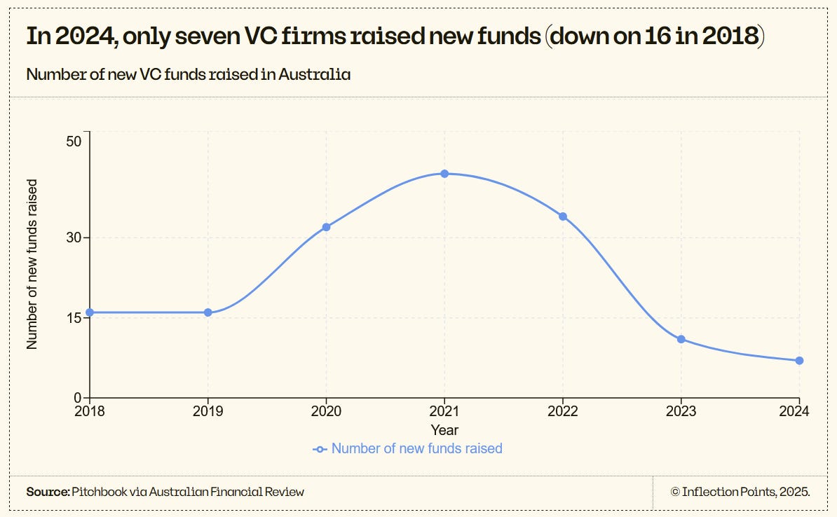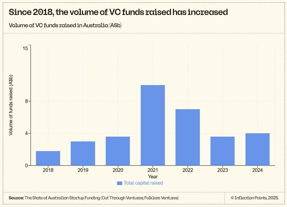 However, a large portion of this capital is starting to concentrate in three megafunds. Thanks in part to the standout performance of Canva, which received early investment from Blackbird Ventures, Square Peg Capital, and Airtree Ventures, these three funds now boast impressive historical returns. This track record has unlocked access to substantial institutional capital from both Australian superannuation funds and international investors.