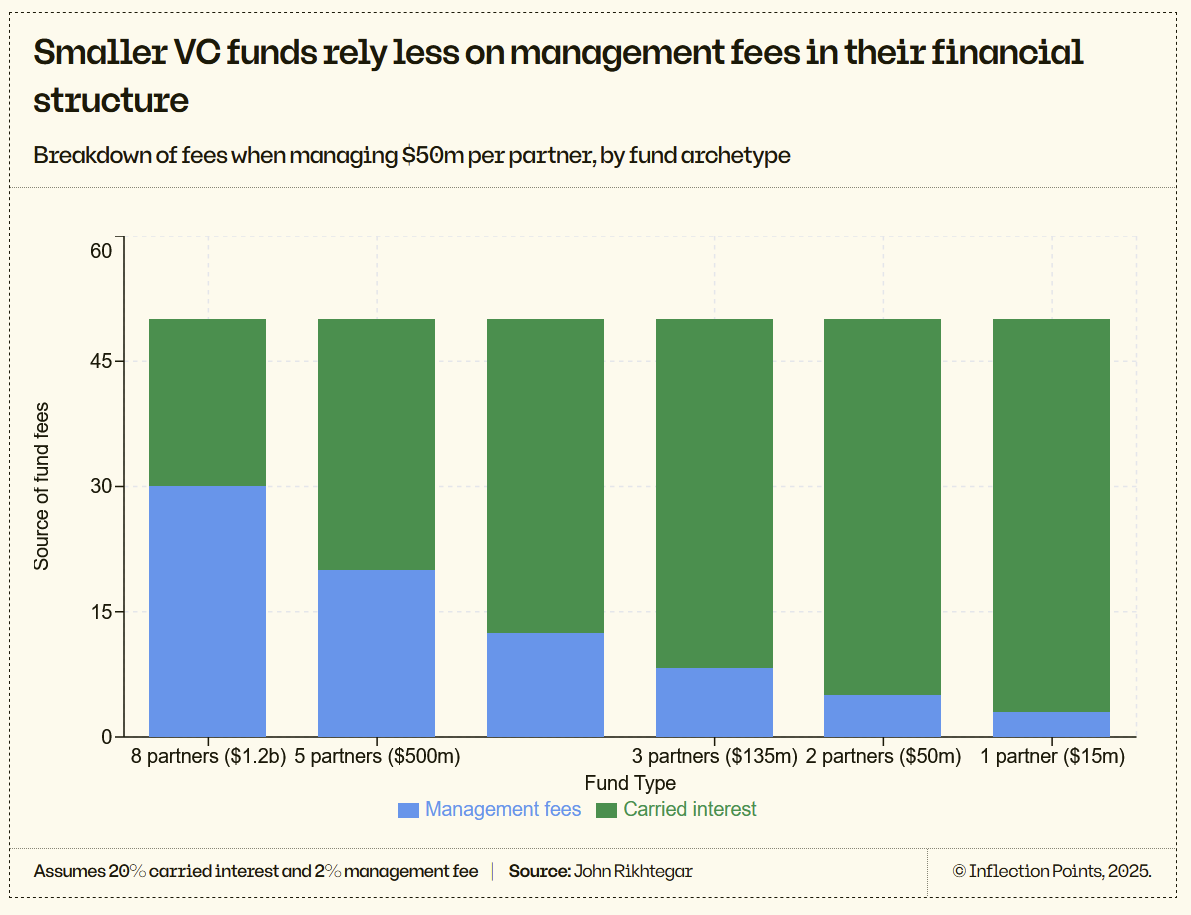 In addition, larger funds are also incentivized to deploy capital quickly so they can raise subsequent funds and grow their management fee base. Funds typically charge a 2% annual management fee on assets under management, meaning a $700 million fund generates $14 million in annual fees before any investment returns. Since management fees scale with fund size regardless of performance, there’s a financial incentive to prioritize speed of capital deployment to raise more large funds.