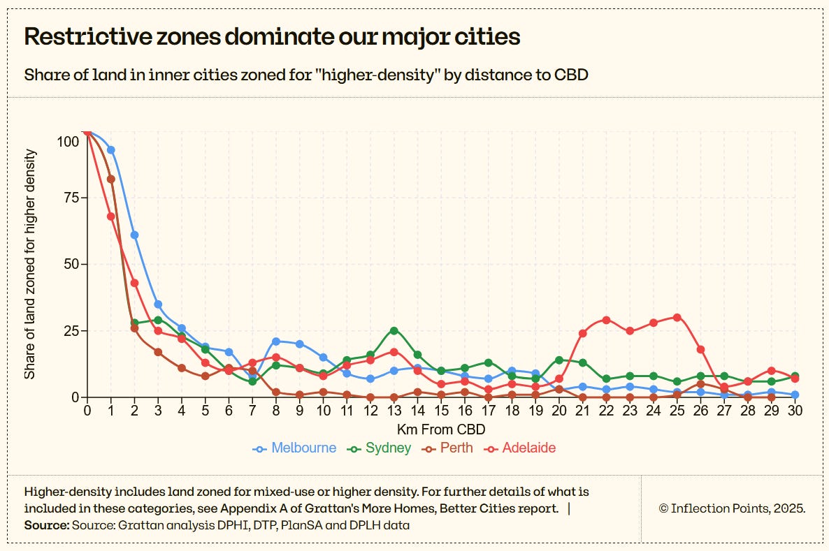 But this isn’t just a problem in our two biggest cities: three quarters or more of residential land in Brisbane, Perth, and Adelaide is zoned for two storeys or fewer.6