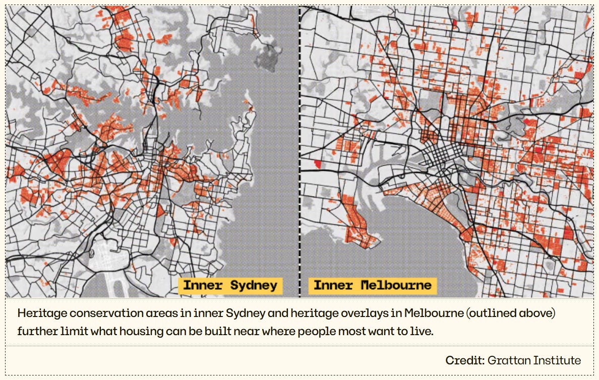 These rules impacts are often exacerbated by heritage protections, which further limit where housing can be built. While prominent heritage buildings are specifically listed on federal and state heritage registers, the bulk of heritage protections are applied by local councils to properties within broad areas via local planning schemes.
