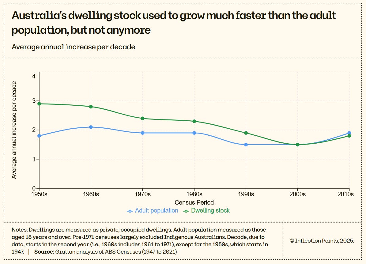 For the first time in decades, Australia’s housing stock is growing more slowly than its population. In the latter half of the 20th century, we consistently built enough to absorb population booms. Since 2000, we haven’t.