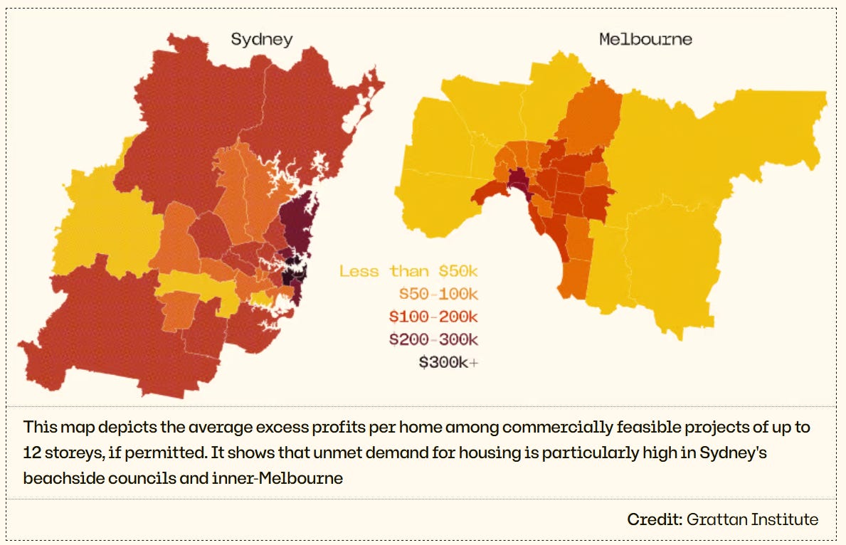 To estimate the impact of those controls, my colleagues and I at the Grattan Institute have estimated average excess profits from building new housing if it were allowed—i.e. profits above the 18 per cent margin usually required to finance development—by comparing the cost of building a series of urban infill housing project of up to 12 storeys in Sydney and Melbourne to the likely sale prices of the new homes across both cities.