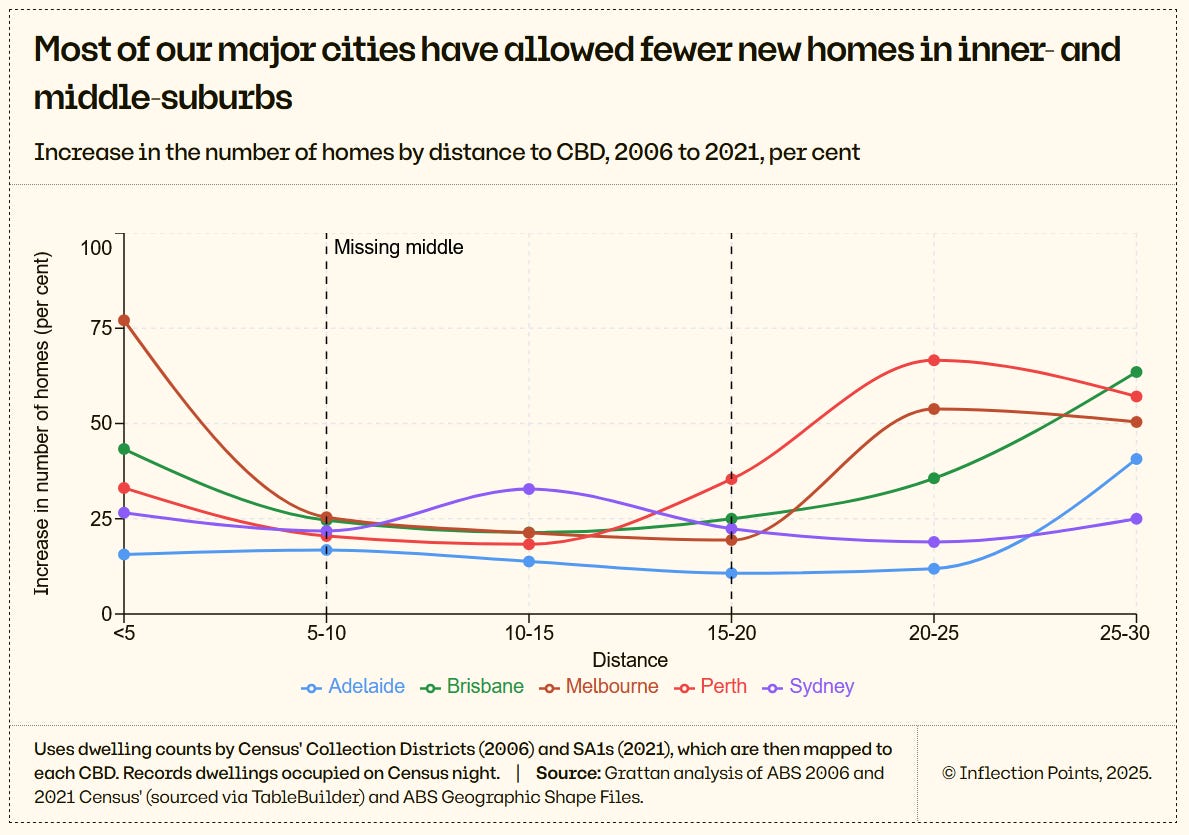 Australia has a particular problem: we’re not building where people want to live. Between 2006 and 2021, most major cities added the fewest new homes in the desirable inner- and middle-ring suburbs: precisely where housing is most expensive and demand is highest.