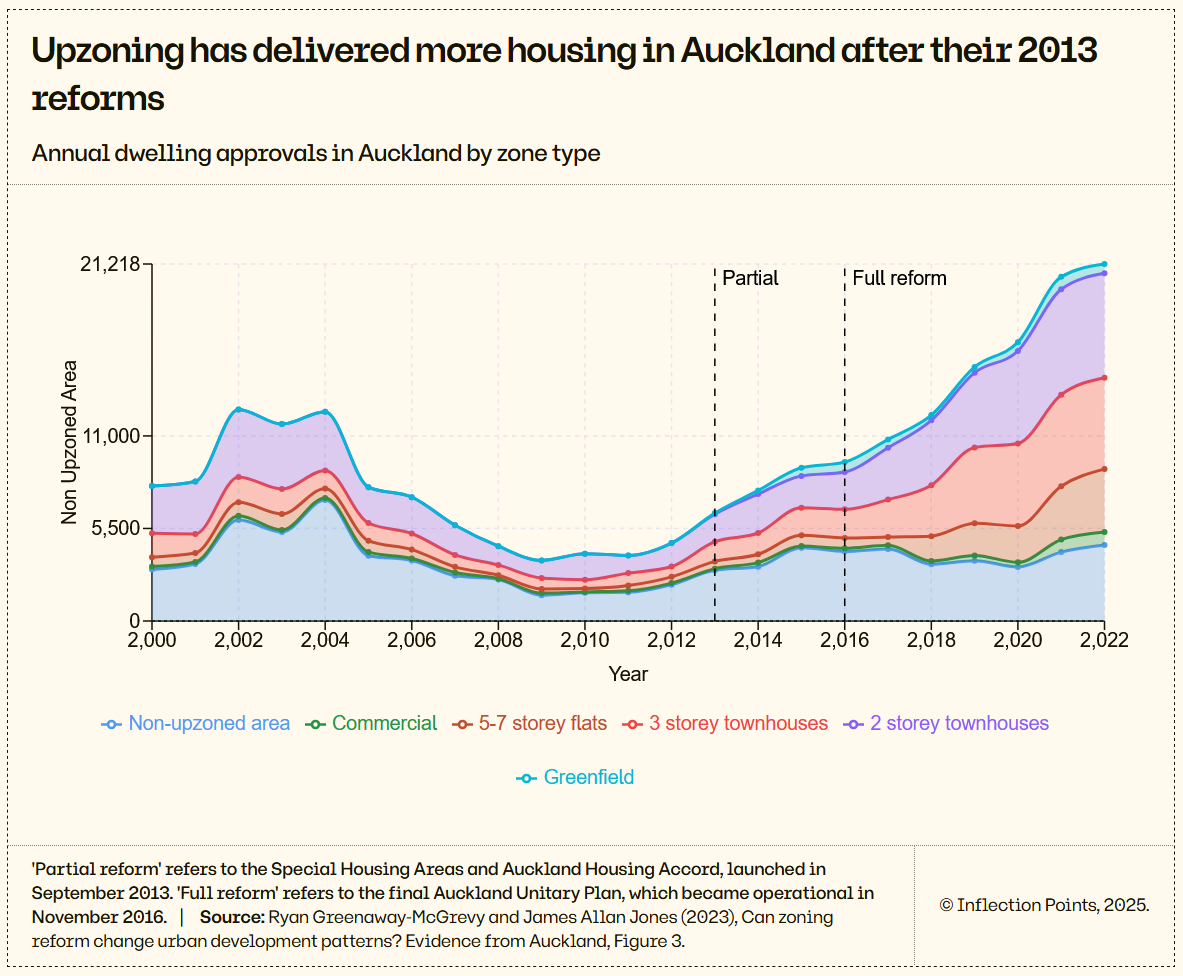 Before the reforms, central Auckland had zoned capacity of about 1.5 times the existing population. Yet housing was still scarce and expensive, because much of that capacity was in low-demand areas where it wasn’t profitable to build, or where existing homeowners were unwilling to move. Auckland’s reforms increased zoned capacity by 60 per cent — the equivalent of the total existing dwelling stock.