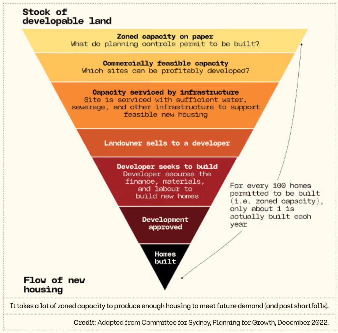 By restricting the ability to build denser housing in desirable areas, planning rules drive a wedge between supply costs and market prices. The gap between what people would be willing to pay to put apartments on a block of land and the current price of that land per extra apartment is an effective measure of how much planning controls are restricting housing on a given site.