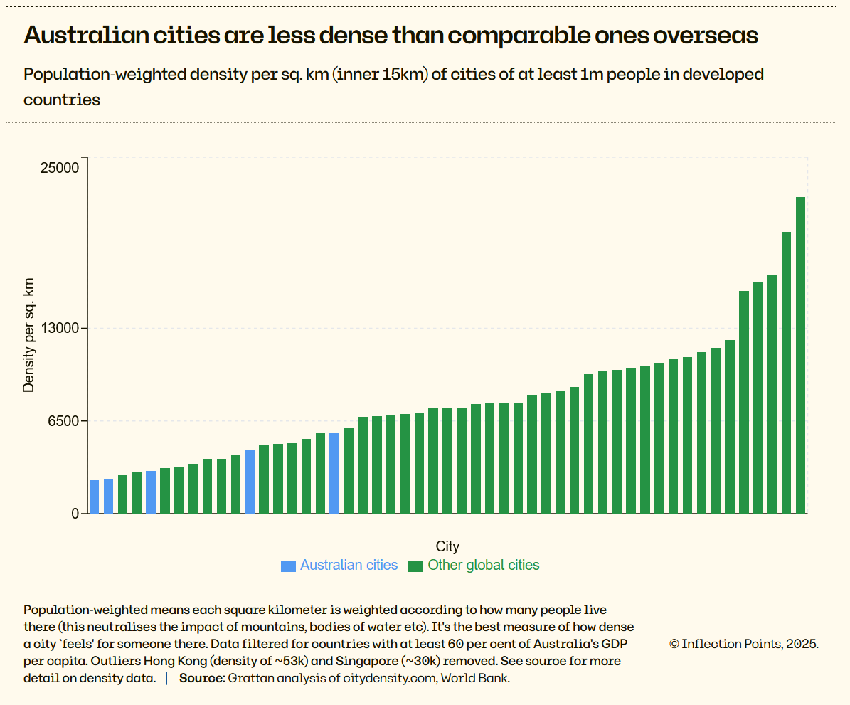 The result is that Australian cities are far less dense than comparable wealthy cities like Toronto, Copenhagen, or Vienna—cities that match or exceed ours on quality-of-life measures, yet house far more people per square kilometre. If inner Sydney were as dense as Toronto, it would have 250,000 additional well-located homes. If inner Melbourne matched Los Angeles, it would have 431,000 more. It’s no coincidence our nation’s cities have some of the most expensive housing in the world.