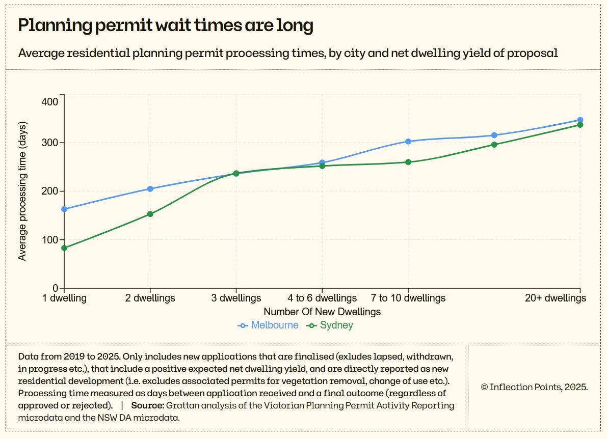 Wait times for planning decisions are also often long: they are nearly a year on average for developments of 20 or more homes in NSW and Victoria.