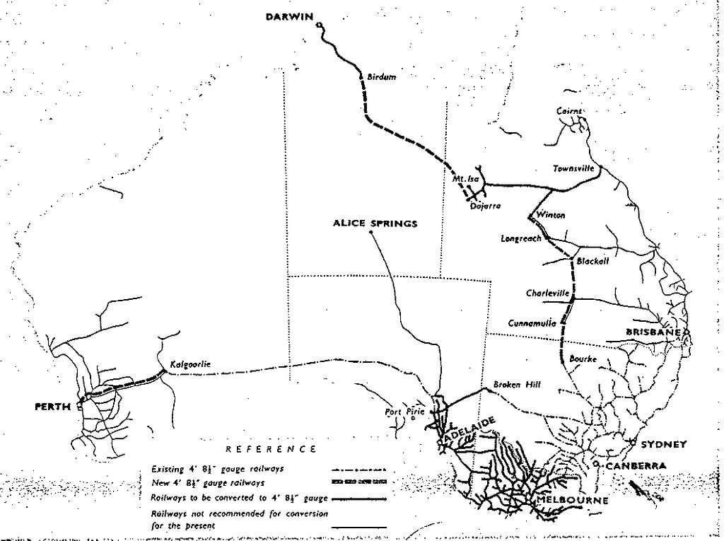 In the report, Clapp detailed the cost of Australia’s fragmented rail network. But he also outlined the gains standardisation could offer: a rail corridor from Brisbane to Perth would connect markets, support growth, and strengthen the federation. He specified (with dotted lines on a map) new tracks to be built or transformed into standard gauge.